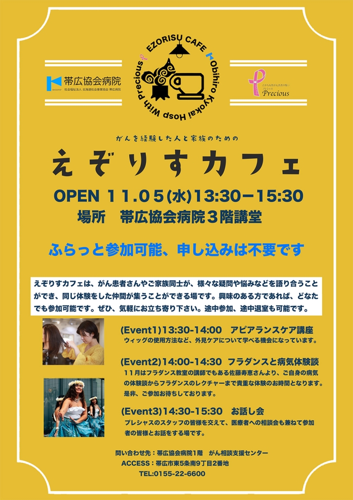 がん患者サロン「えぞりすカフェ」11月開催 更新日:2025年10月06日お知らせ 11月はフラダンス教室の講師でもある佐藤寿恵さんより、ご自身の病気の体験談からフラダンスのレクチャーまで貴重な体験のお時間となります。 ぜひ、ご参加お待ちしております。 がん患者サロン「えぞりすカフェ」