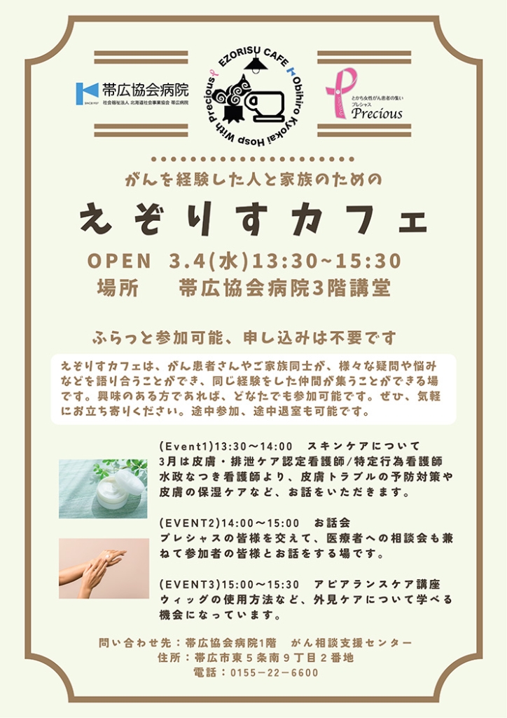 3月のえぞりすカフェは帯広協会病院の皮膚・排泄ケア認定看護師/特定行為看護師 水政なつき看護師より、皮膚トラブルの予防対策や皮膚の保湿ケアなどについてお話していただきます。