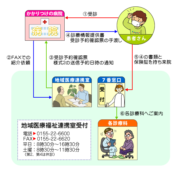 - かかりつけの病院より紹介依頼のFAXを協会病院地域医療福祉連携室に送信します。